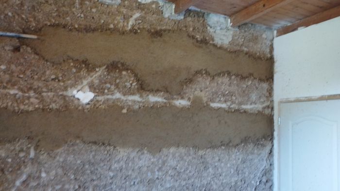 Elle a été, comme beaucoup de vieilles dames, un peu malmenées par nos prédécesseurs successifs : enduits en ciment portland sur toute sa surface, isolation négligée et inadaptée et du coup, si rien n’est fait, elle ne sera pas viable dans le temps (ce n’est pas si rare que des maisons en pisé s'effondrent ou soient carrément rasées par méconnaissance du bâti ancien).