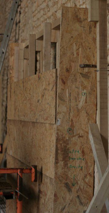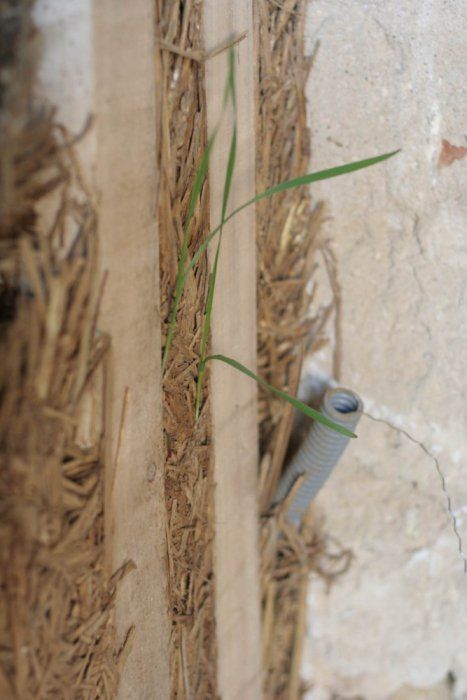 Du 15 avril au 8 Mai: chantier terre/paille sur 42m2 en 15cm soit 6,5m3 dans la grange donc à l’abri.