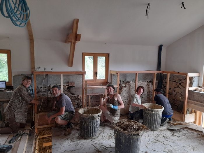 Après un premier chantier participatif en juin (terre paille allégée), nous voilà rendu à la seconde étape de l'isolation : le corps d'enduit, soit une épaisseur de quelques cm de terre (+ sable et un peu de paille) qui vient recouvrir le banchage terre paille. L'ensemble de l'isolation concernée représente 30 m2.