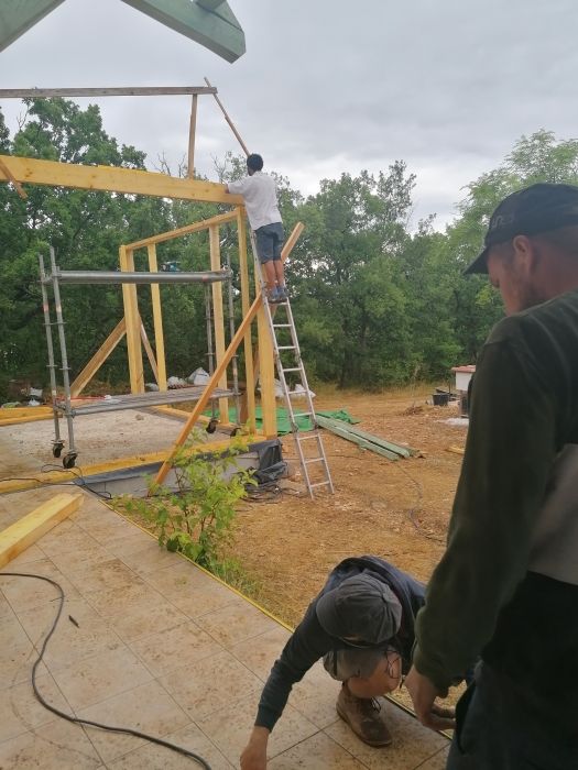 -Reprise de la charpente : on refait tout en ajoutant de vraies fermes, on en profite pour agrandir. +Casquette à 50° pour accueillir en "phase 7" des panneaux solaires thermiques.