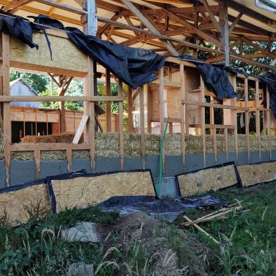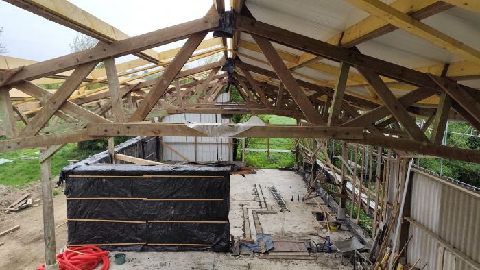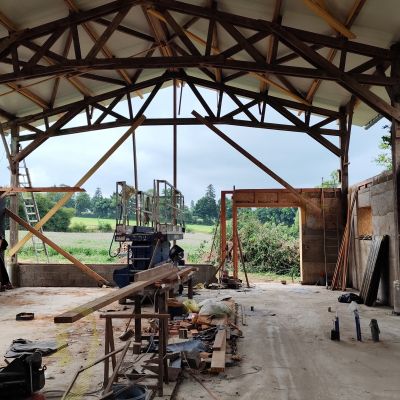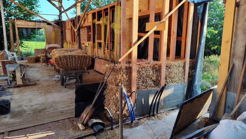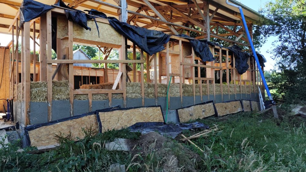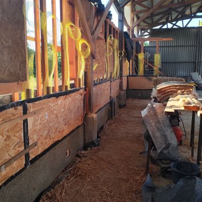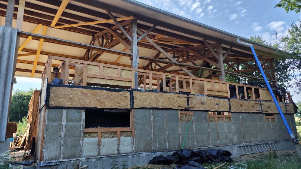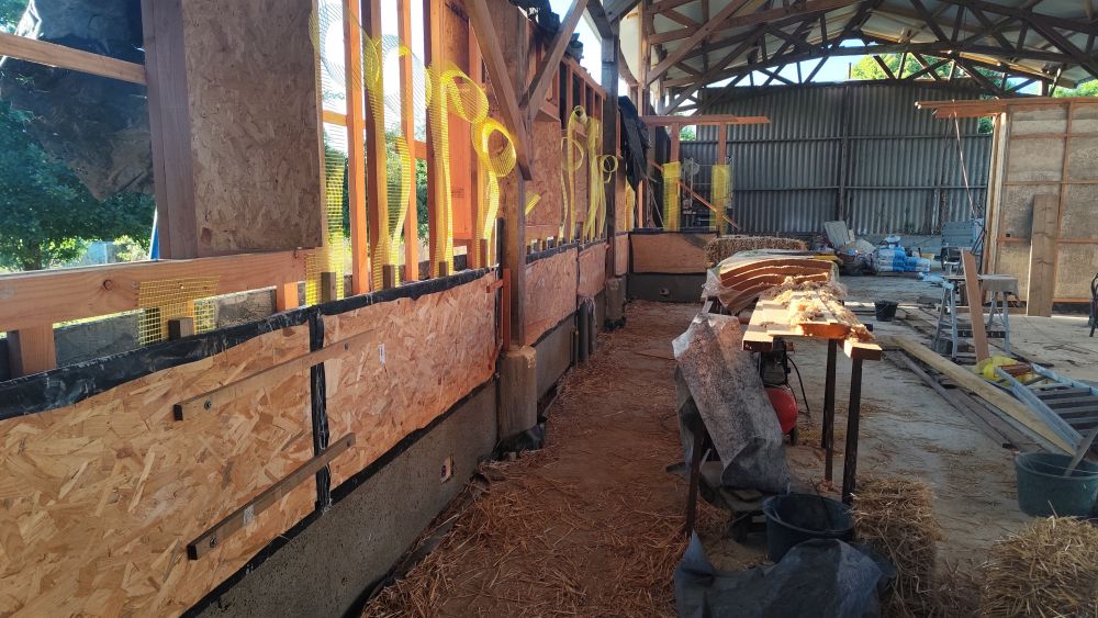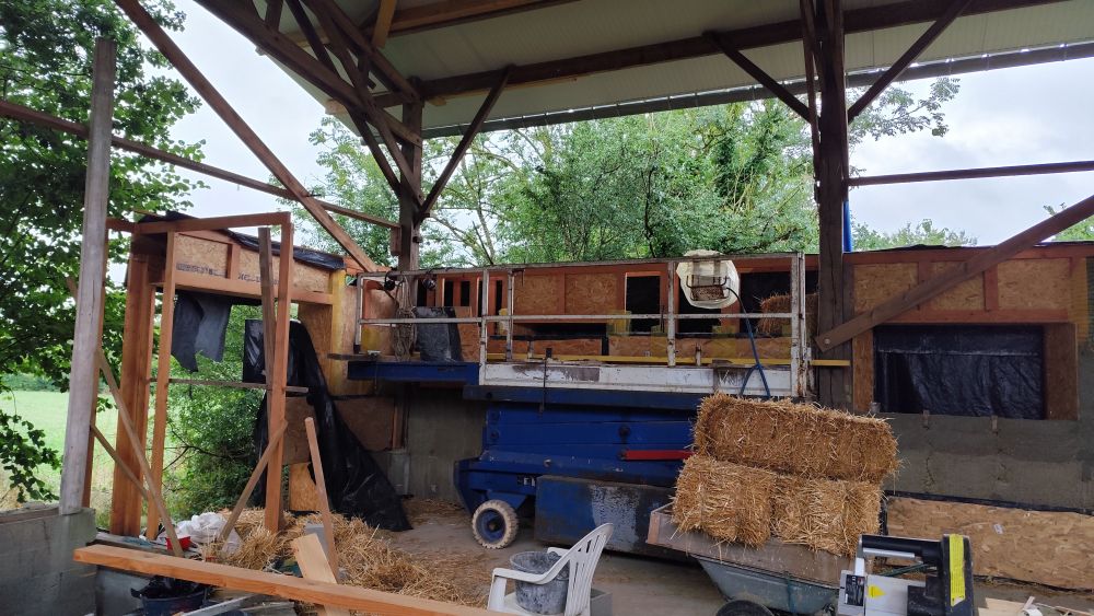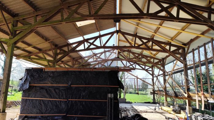 Pour la petite histoire, le projet initial était plutôt une construction du genre earthship inspiré, mais les contraintes d’occupation des sols, ne permettait dans le contexte, que la transformation d’un bâtiment existant. Il y avait alors deux possibilités : soit une grange en torchis, soit un hangar agricole, la grange est moins bien située, notamment au niveau ensoleillement et la proximité du hangar n’était pas très heureuse. Le hangar est lui très bien situé, central, ensoleillement optimum. Le choix s’est porté sur le hangar. La contrepartie est l’obligation de conserver l’ensemble de la structure qui est imposante (25m x13m x 7m de hauteur). La partie habitable d’une centaine de mètres carré, se limitera sur la moitié sud et sur un seul niveau, l’étage restera un plateau, éventuellement aménageable dans le futur, et le reste, cellier, atelier, garage,…)