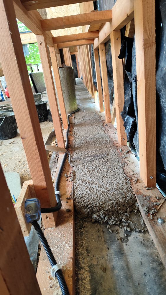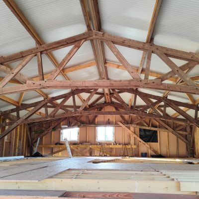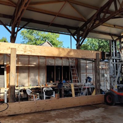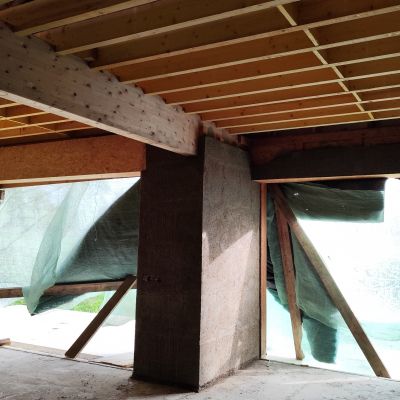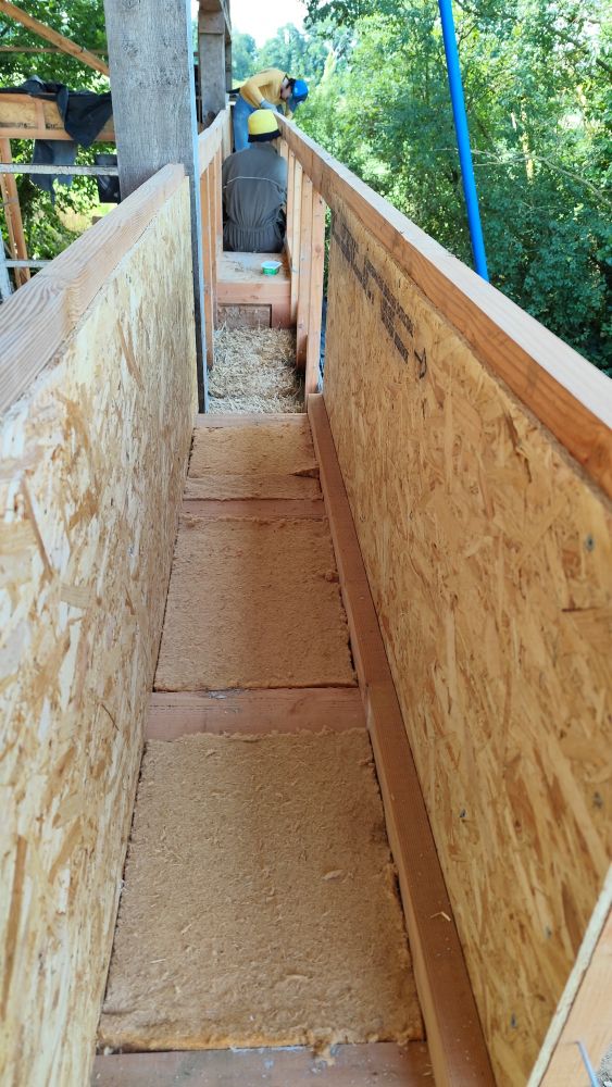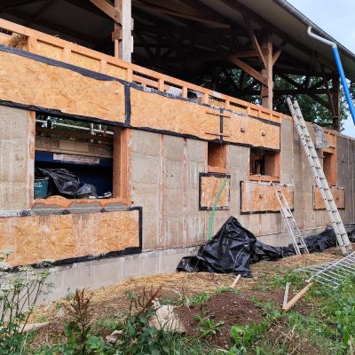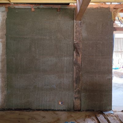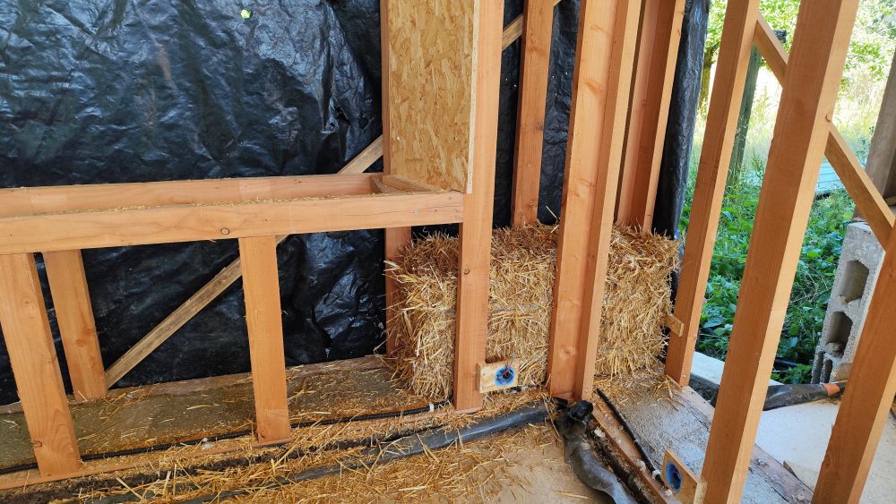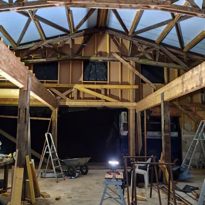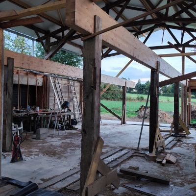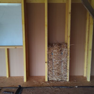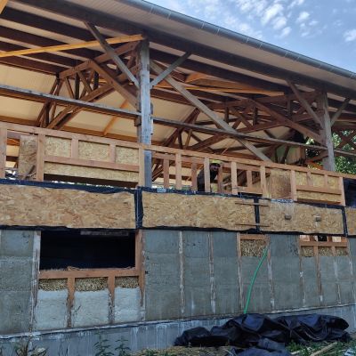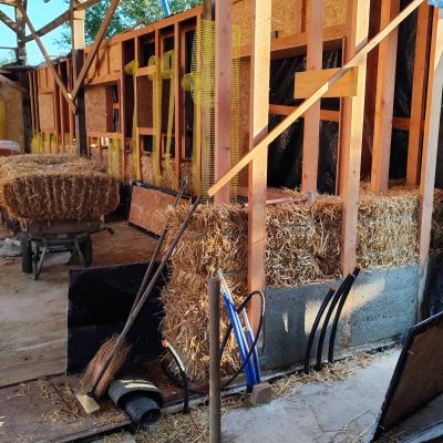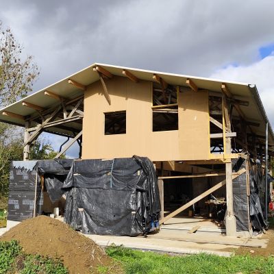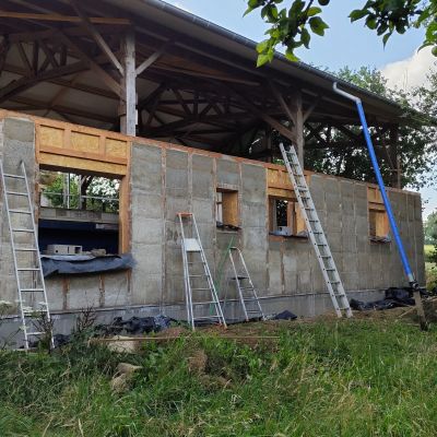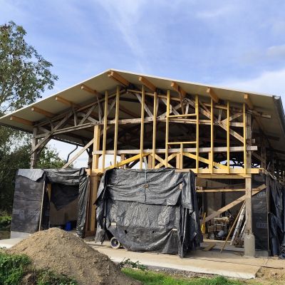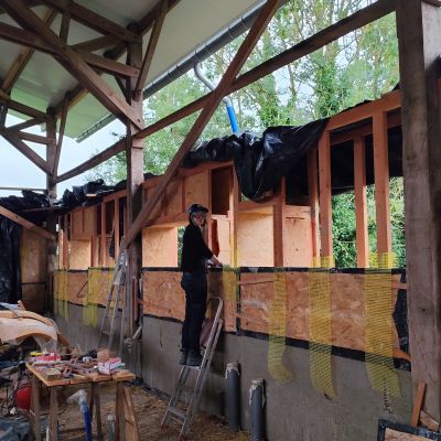 Pour la petite histoire, le projet initial était plutôt une construction du genre earthship inspiré, mais les contraintes d’occupation des sols, ne permettait dans le contexte, que la transformation d’un bâtiment existant. Il y avait alors deux possibilités : soit une grange en torchis, soit un hangar agricole, la grange est moins bien située, notamment au niveau ensoleillement et la proximité du hangar n’était pas très heureuse. Le hangar est lui très bien situé, central, ensoleillement optimum. Le choix s’est porté sur le hangar. La contrepartie est l’obligation de conserver l’ensemble de la structure qui est imposante (25m x13m x 7m de hauteur). La partie habitable d’une centaine de mètres carré, se limitera sur la moitié sud et sur un seul niveau, l’étage restera un plateau, éventuellement aménageable dans le futur, et le reste, cellier, atelier, garage,…)