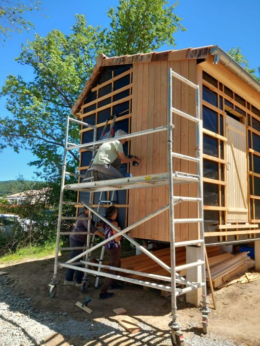 Nous avons déjà bien commencé le bardage extérieur et nous entamons le montage et doublage des cloisons intérieures.