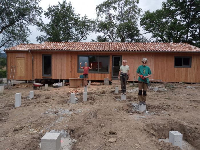 Notre projet, c'est de vivre dans un éco-habitat partagé. Il y aura 4 petits logements individuels et une maison commune qui nous permettra de vivre des moments conviviaux mais aussi de mutualiser certains besoins : chambre d'amis, machine à laver, atelier. La construction en bois paille, l'électricité et la plomberie sont faits par des artisans. Le reste : bardage, monter des cloisons, doubler les murs en terre, poser le travertin, c'est nous qui le faisons. Avec toi ?