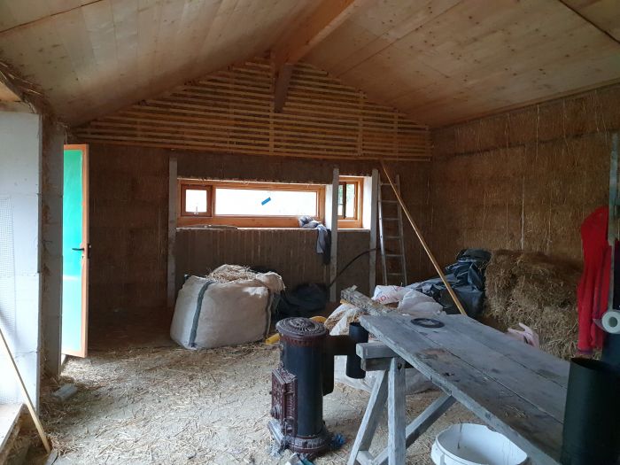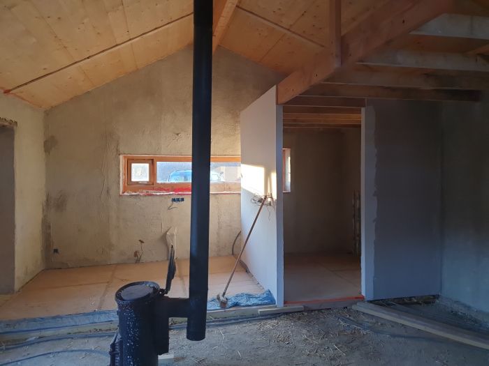 Ensuite, nous passerons aux enduits intérieurs (barbotine, torchis et finition) avec un poêle à bois afin de sécher plus rapidement, et pour réchauffer les travailleurs.