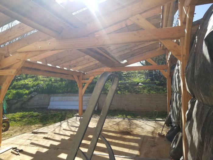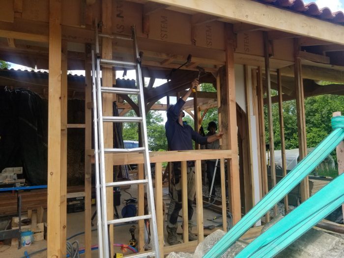 On construit un octogone en bois sur fondations légères, une vingtaine de pieux d'acacia enfoncés dans le sol. Il est isolé en sciure et copeaux au sol, en fibre de bois murs et toiture. Il fait une trentaine de mètres carrés. La structure a été levée il y a 3 mois. On a posé la fibre de bois en toiture et l'EPDM. On a fini l'isolation des murs et du sol ainsi que le parquet.