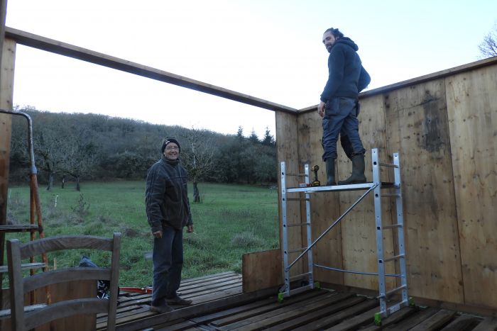 Le chantier concerne aujourd’hui le montage d’une maisonnette en bois pour y vivre avec Robinson. Il s’agit d'un ensemble de chalets bâtis les uns proches des autres, qui formeront un petit lieu de vie chaleureux pour notre petite famille :) et ainsi libérer les autres espaces pour des activités ouvertes sur l’extérieur.